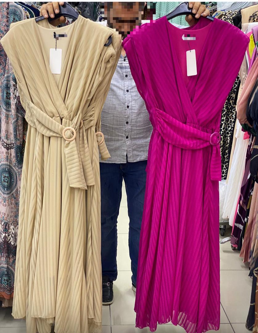 The belt is secured with a circular buckle. The dresses are made of a textured, likely lightweight fabric and come in a beige/light tan and a bright pink/magenta color.